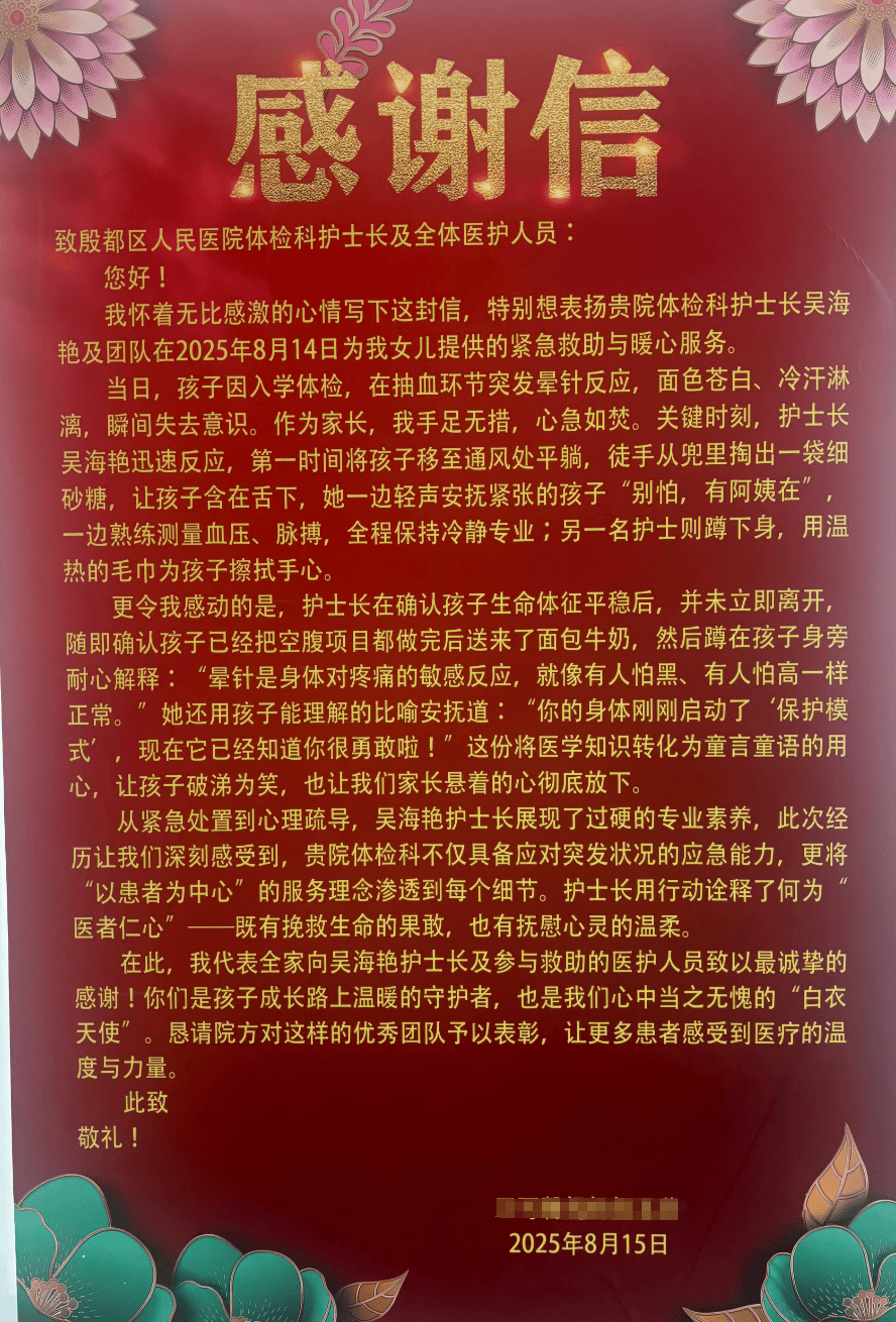 而在健康管理科的墻上,除了劉女士送來的錦旗,一封感謝信也常常吸引著體檢者的目光,那是小馨(化名)媽媽特意送來的,字里行間滿是對科室醫(yī)護(hù)人員的感激,講述著一段因 “暈針” 而起的溫暖故事。