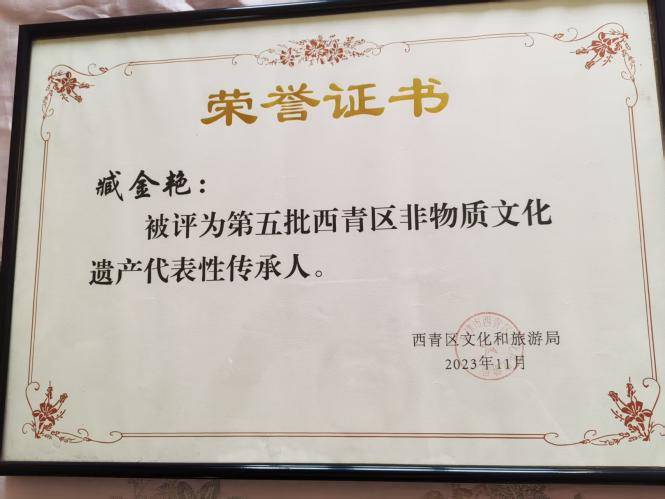 時光不負趕路人,經(jīng)過刻苦的學(xué)習(xí),繪畫技術(shù)的長進,她的作品被書畫界及非遺文化機構(gòu)認可,在社會上贏得年畫愛好者們的認可,多次參加畫展,有的被舉辦方收藏。一個又一個的榮譽向她走來。2019年12月21日,她的作品參展了慶祝新中國成立70周年首屆當(dāng)代翰墨名家展示,榮獲了一等獎。2016年10月,其作品《和諧社會生活美如畫》入選2016年山東省文化廳主辦、山東省文化廳非物質(zhì)文化遺產(chǎn)處和山東美術(shù)館承辦的“非遺于文創(chuàng)——第四屆中國非遺博覽會之高等院校文創(chuàng)成果展”。2023年11月,她被評為第五批西青區(qū)非物質(zhì)文化遺產(chǎn)代表性傳承人。2025年12月31日,她收到楊柳青鎮(zhèn)綜合便民服務(wù)中心、天津市楊柳青年畫協(xié)會頒發(fā)的“木板傳古韻,年畫譜新章”楊柳青木版年畫人才培養(yǎng)班結(jié)業(yè)證書。她的學(xué)習(xí)繪畫之路是刻苦的,是勤奮的,有的培訓(xùn)課要晝夜跟老師學(xué)習(xí),需要住宿幾天。她都從不放棄每次學(xué)習(xí)的機會。