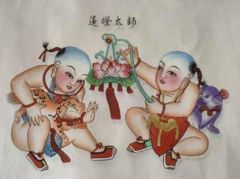 《蓮燈太師》描繪兩個娃娃在觀燈戲獅狗,以“蓮”“燈”“獅”諧音,古代官制,太師為三公之音,故蓮燈太師即連登太師,為祝愿發(fā)跡升官之頌詞。