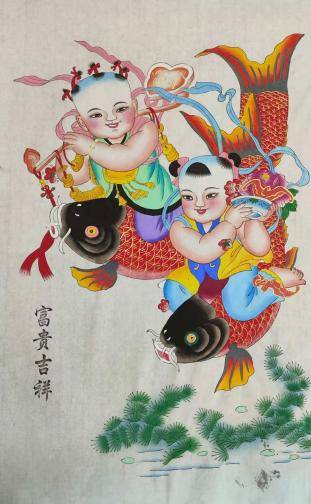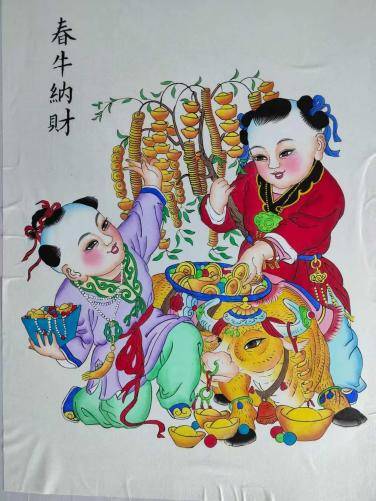 一年之計在于春,春牛納財,春天耕牛遍地走,象征著播撒勤奮的種子,將收獲滿滿的財富。中國人常把魚作為富裕的寓意,這種畫送人有面子有禮儀。楊柳青年畫的娃娃與大鯉魚的版畫多姿多彩,已為經(jīng)典之名畫,深受人們的歡迎。