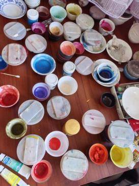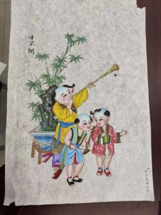 今年的春天,我們相約會談,走近了她。她衣著樸素,善良憨厚的笑容,利落的短發(fā)像一縷縷青絲自然發(fā)亮。她的眼神一絲不茍的凝視著那套大氣的年畫冊頁,向我介紹版畫里面的內(nèi)容及制作工藝,這本冊頁含有12張經(jīng)典年畫。這是她為客戶代加工的作品,目前訂單很多,這份訂單她剛開始著手繪描,下一份加工作品又給她送來。一間十幾平米的畫室窗明幾凈,地面潔白。白色案臺和方桌上擺滿了七彩繽紛的年畫顏料,不下幾十種,她告訴我先從哪下筆描繪,最后從哪里收筆。畫冊主體顏色是以紅黃藍為調(diào)色的。里面的人物姿態(tài)萬千,充滿了靈動性。我對這本冊頁很感興趣,仔細觀察每一幅畫的人物造型。描顏色是要把原版圖片橫放的,而不是正面描色,側(cè)描有利于最后對人物眼睛的線條收筆。在這里,聞到了水墨丹青的韻味,看到的是非遺文化的光芒在閃爍。