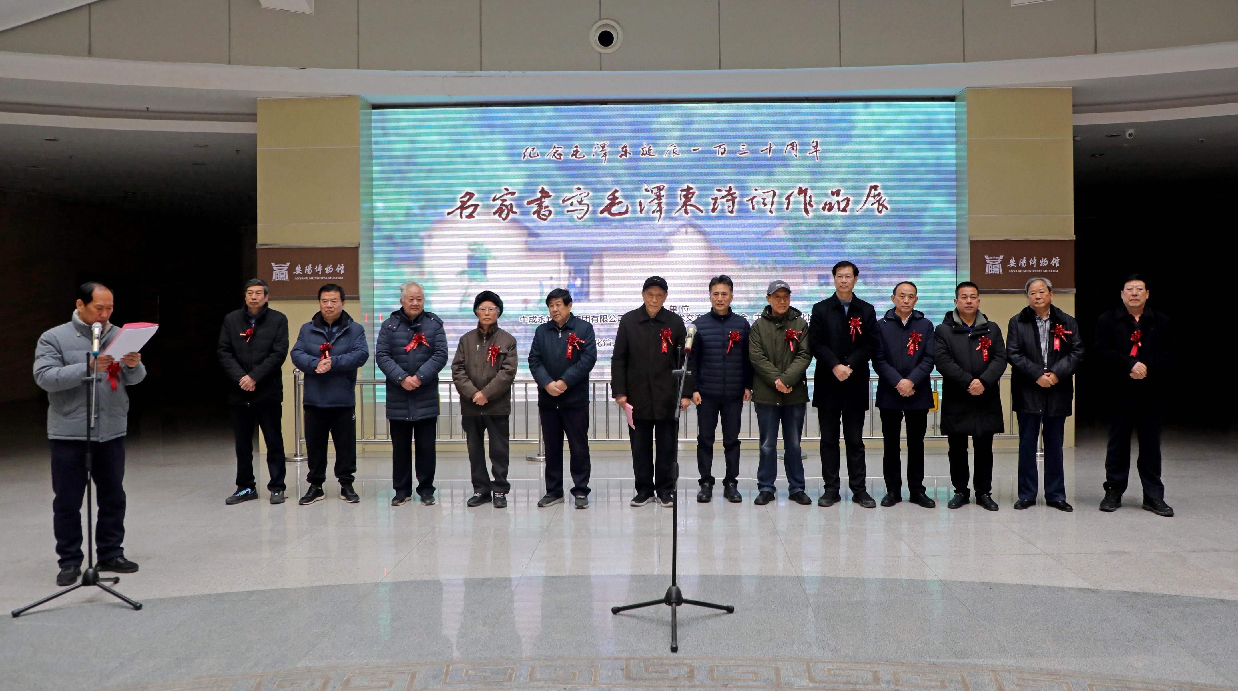 2023年12月24日,由中媒文化藝術交流工作委員會、中國現代文化網、中成永峰建設集團有限公司主辦,安陽市文化館美術館、河南榮在駿電子科技有限公司協辦,安陽市書法家協會指導,紀念毛澤東主席誕辰130周年“名家書寫毛澤東詩詞作品展”在河南安陽文化館美術館隆重開幕,安陽市政協副主席薛文明,安陽市人大原副主任高福生、史東林、王希社,安陽工學院黨委委員、工會主席牛瑞慶,安陽市人民政府原副秘書長劉繼賢,安陽市政協原副秘書長宋保兵,安陽市委宣傳部原副部長、廣播電視臺黨委書記、臺長于良,安陽市總工會原副主席宋忠平,市住建局原黨委副書記、老年書畫研究會會長高志起,安陽市郵政管理局原局長李現軍,中成永峰建設集團有限公司董事長郝合興,中媒文化藝術交流工作委員會主席、中國現代文化網總編、北京寫作學會文化藝術促進會執行主席林臏,安陽市書協名譽主席李建學,市書協副主席王興學、管遮嵩、陳則威、韓濤、侯典鑫、丁國朝、付加紹、李青林以及市攝影家協會副主席馬慶祥、市美協副主席鄧曉峰等出席開幕式。開幕式由安陽市文聯原主席、市書協名譽主席李建學主持。