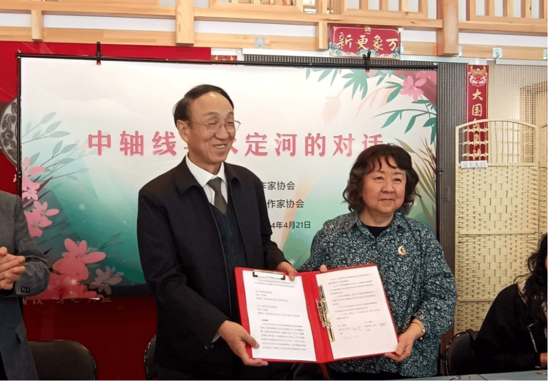 韓小蕙與李金明簽訂《雙方共同促進(jìn)北京中軸線與永定河文學(xué)作品創(chuàng)作合作協(xié)議》