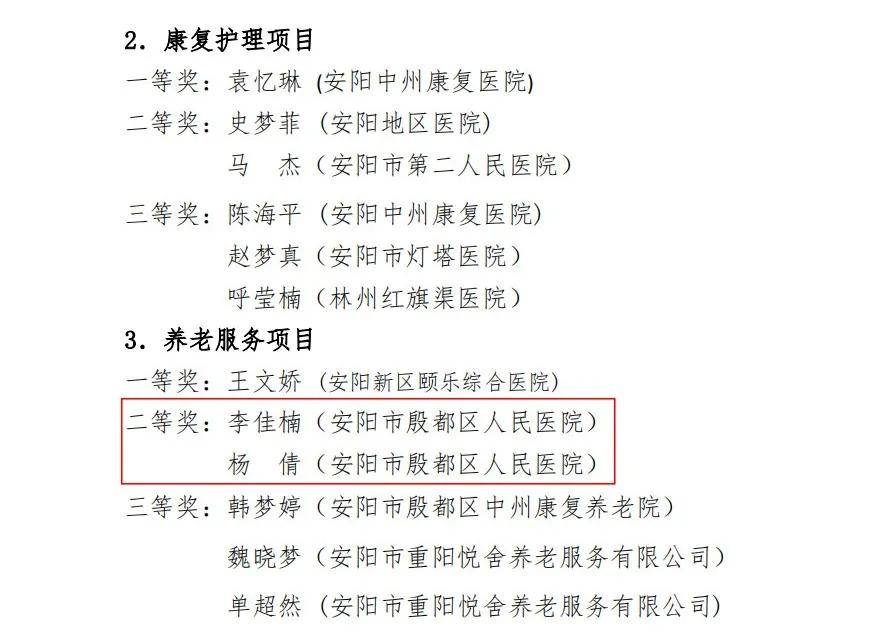 大賽設置了康復治療、康復護理、養(yǎng)老服務三個競賽項目,吸引全市23家醫(yī)養(yǎng)機構的100余名從業(yè)人員參加。經過激烈角逐,殷都區(qū)人民醫(yī)院康復科李子昂在康復治療項目中榮獲二等獎,康復科范子涵在康復治療項目中榮獲三等獎,內科重癥李佳楠、醫(yī)養(yǎng)結合科楊倩在養(yǎng)老服務項目中榮獲二等獎。